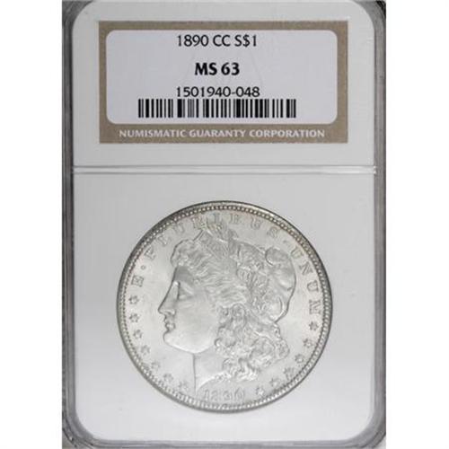 <B>1890-CC $1 MS63 NGC.</B></I> A solidly struck Select Mint State representative of this later Carson City silver dollar issue, lightly toned silver-blue with elements of sea-green. Uncommonly appealing for the grade, with few marks, particularly on the devices. <BR><BR><B>Coin Engraver:</B> George T. Morgan<BR><BR><b>Shipping:</b> Coins & Currency (<a target="_blank" href="http://www.heritageauctions.com/common/shipping.php">view shipping information</a>)