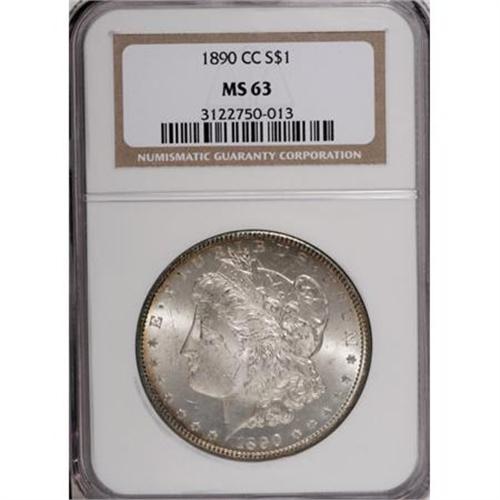 <B>1890-CC $1 MS63 NGC.</B></I> This is an outstanding example of the '90-CC Morgan dollar, for the grade. The striking details are excellent, with the hair detail just above Liberty's ear and the eagle's breast feathers crisply defined. Vibrant, coruscating luster creates dazzling cartwheels over each side. A few minor marks on the obverse define the grade. <BR><BR><B>Coin Engraver:</B> George T. Morgan<BR><BR><b>Shipping:</b> Coins & Currency (<a target="_blank" href="http://www.heritageauctions.com/common/shipping.php">view shipping information</a>)