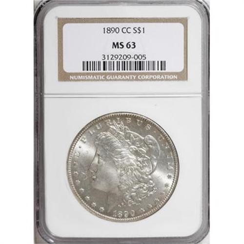 <B>1890-CC $1 MS63 NGC.</B></I> An attractive Select Mint State example of this popular Carson City issue. More than 2.3 million pieces were produced, and uncirculated survivors are readily available to type collectors at grade levels through MS63. This piece is highly lustrous and boldly struck, with light champagne-gold accents on each side. Typically marked for the grade. <BR><BR><B>Coin Engraver:</B> George T. Morgan<BR><BR><b>Shipping:</b> Coins & Currency (<a target="_blank" href="http://www.heritageauctions.com/common/shipping.php">view shipping information</a>)