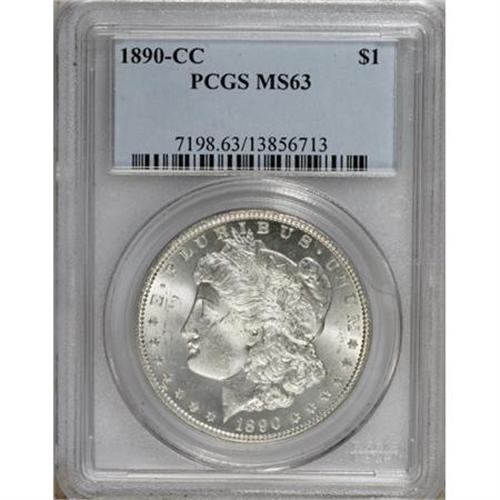 <B>1890-CC $1 MS63 PCGS.</B></I> PCGS Population (2594/1875). NGC Census: (1130/813). Mintage: 2,309,041. Numismedia Wsl. Price for NGC/PCGS coin in MS63: $750. (#7198)<BR><BR><B>Coin Engraver:</B> George T. Morgan<BR><BR><b>Shipping:</b> Coins & Currency (<a target="_blank" href="http://www.heritageauctions.com/common/shipping.php">view shipping information</a>\)