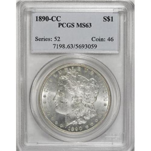 <B>1890-CC $1 MS63 PCGS.</B></I> This solidly struck Select CC-mint example offers pleasing detail and minimal patina. The fields are well-preserved, though three horizontal abrasions at Liberty's lower jaw define the grade.<BR><I>From The Mario Eller Collection, Part One.</B></I><BR><BR><B>Coin Engraver:</B> George T. Morgan<BR><BR><b>Shipping:</b> Coins & Currency (<a target="_blank" href="http://www.heritageauctions.com/common/shipping.php">view shipping information</a>)
