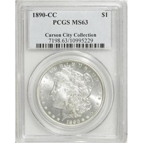 <B>1890-CC $1 MS63 PCGS.</B></I> Ex: Carson City Collection. The brilliant surfaces display intense mint frost over both sides. Well struck with crisp details noted above Liberty's ear and on the eagle's breast feathers. A couple of superficial scrapes and scattered tiny contact marks define the grade. <BR><BR><B>Coin Engraver:</B> George T. Morgan<BR><BR><b>Shipping:</b> Coins & Currency (<a target="_blank" href="http://www.heritageauctions.com/common/shipping.php">view shipping information</a>)