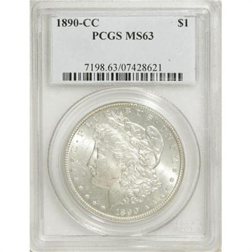 <B>1890-CC $1 MS63 PCGS.</B></I> VAM-5. Delicate tan toning graces this exactingly struck and thoroughly lustrous Carson City Morgan. The fields are well preserved, and the face is only moderately abraded. The mintmark is repunched.<BR><BR><B>Coin Engraver:</B> George T. Morgan<BR><BR><b>Shipping:</b> Coins & Currency (<a target="_blank" href="http://www.heritageauctions.com/common/shipping.php">view shipping information</a>)