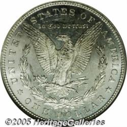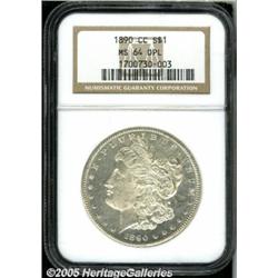 <B>1890-CC<img border='0' src='http://www.heritagecoins.com/images/star.gif' width=10 height=10>$1 MS64 Deep Mirror Prooflike NGC.</B></I> Although only a Choice Mint State example, this is exceedingly important for its Deep Mirror Prooflike surfaces. Few examples of this issue are exist so deeply mirrored. The devices have frosty luster, imparting a highly desirable cameo contrast. The surfaces are entirely brilliant and untoned. Population: 105 in 64 DMPL, 6 finer (2/05).