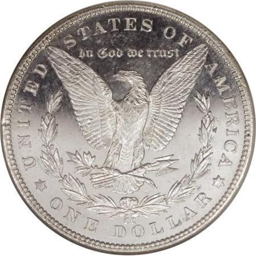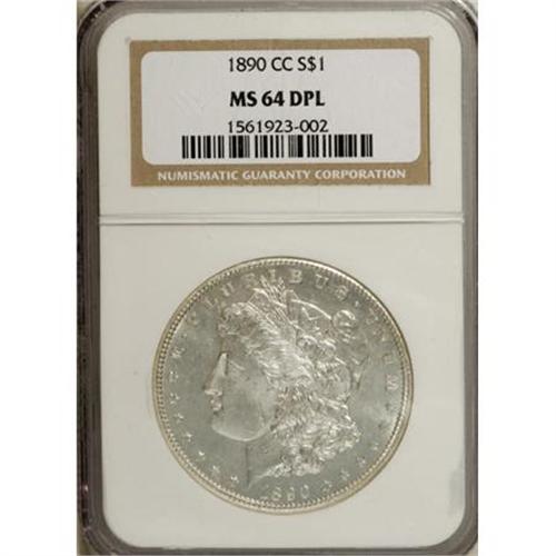 <B>1890-CC $1 MS64 Deep Mirror Prooflike NGC.</B></I> Much like its more famous Carson City predecessor, Mint State survivors of the 1890-CC have a greater tendency to exhibit prooflike qualities than the typical issue. The catch is to find a coin that is not heavily abraded and this is one such example. Untoned surfaces are highly reflective and, aside from an abrasion near Liberty's jaw along with milling marks on her neck, there are few appreciable signs of contact. <BR><BR><b>Shipping:</b> Coins & Currency (<a target="_blank" href="http://www.heritageauctions.com/common/shipping.php">view shipping information</a>)
