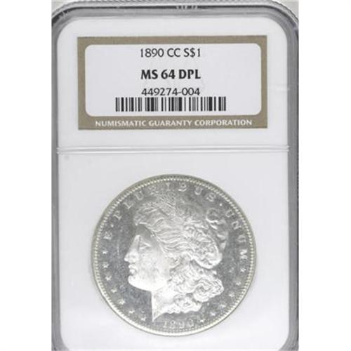 <B>1890-CC $1 MS64 Deep Mirror Prooflike NGC.</B></I> While a sizeable percentage of the known survivors of this issue are Prooflike and Deep Mirror Prooflike, few are extant in MS64 and even fewer are known in Gem condition. This is a brilliant coin that exhibits deeply reflective mirrors on each side with starkly contrasting white devices. Fully struck, a few scattered abrasions account for the less-than-Gem grade of this impressive CC dollar.<BR><BR><b>Shipping:</b> Coins & Currency (<a target="_blank" href="http://www.heritageauctions.com/common/shipping.php">view shipping information</a>)