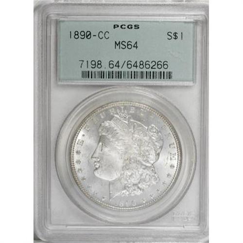 <B>1890-CC $1 MS64 PCGS.</B></I> This CC-mint dollar exhibits dynamic luster, a sharp strike, and a hint of powder-blue and straw-gold toning. Certified in an old green label holder.<BR><BR><B>Coin Engraver:</B> George T. Morgan<BR><BR><b>Shipping:</b> Coins & Currency (<a target="_blank" href="http://www.heritageauctions.com/common/shipping.php">view shipping information</a>)