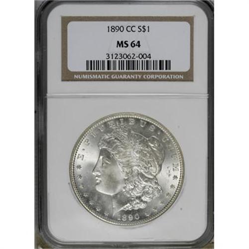 <B>1890-CC $1 MS64 NGC.</B></I> This flashy, untoned example is highly lustrous and minimally marked for the grade. The design elements are crisply struck, and the piece has substantial eye appeal. <BR><BR><B>Coin Engraver:</B> George T. Morgan<BR><BR><b>Shipping:</b> Coins & Currency (<a target="_blank" href="http://www.heritageauctions.com/common/shipping.php">view shipping information</a>)