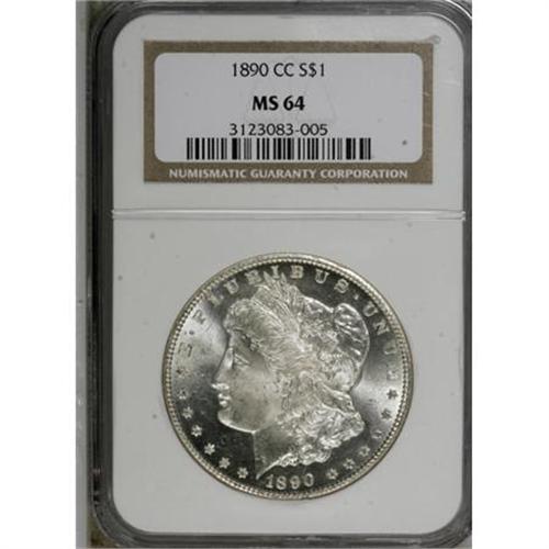 <B>1890-CC $1 MS64 NGC.</B></I> This is a great near-Gem representative of this popular Carson City issue, and one that seems close to receiving either a Gem grade or a Prooflike designation. Well struck throughout, with minimal marks and only faint hints of toning. Definitely a high-end example.<BR><BR><B>Coin Engraver:</B> George T. Morgan<BR><BR><b>Shipping:</b> Coins & Currency (<a target="_blank" href="http://www.heritageauctions.com/common/shipping.php">view shipping information</a>)