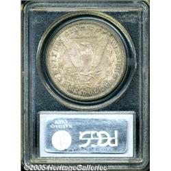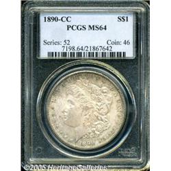 <B>1890-CC<img border='0' src='http://www.heritagecoins.com/images/star.gif' width=10 height=10>$1 MS64 PCGS.</B></I> Medium shades of gray, blue, and sunset-golden toning can not conceal the underlying luster on this near-Gem specimen. Well struck with a minimum of marks for the assigned grade.