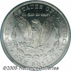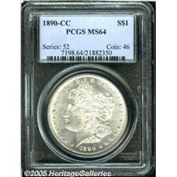 <B>1890-CC<img border='0' src='http://www.heritagecoins.com/images/star.gif' width=10 height=10>$1 MS64 PCGS.</B></I> This powerfully struck, cloud-white Morgan is a few trivial bagmarks away from a coveted MS65 grade. Both sides display billowy mint frost and pleasing cartwheel effects. This lovely coin should be important to both Morgan Dollar collectors and Carson City specialists.