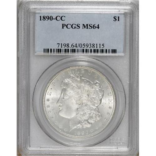 <B>1890-CC $1 MS64 PCGS.</B></I> Despite a mintage of over 2.3 million pieces, the 1890-CC is not so available in Mint State grades as some earlier issues with much lower production figures. This sharply struck Choice piece has powerful luster, though splashes of chalk-white and cloud-gray color appear on the natural silvery surfaces. Small, scattered abrasions are present as well.<BR><BR><b>Shipping:</b> Coins & Currency (<a target="_blank" href="http://www.heritageauctions.com/common/shipping.php">view shipping information</a>)