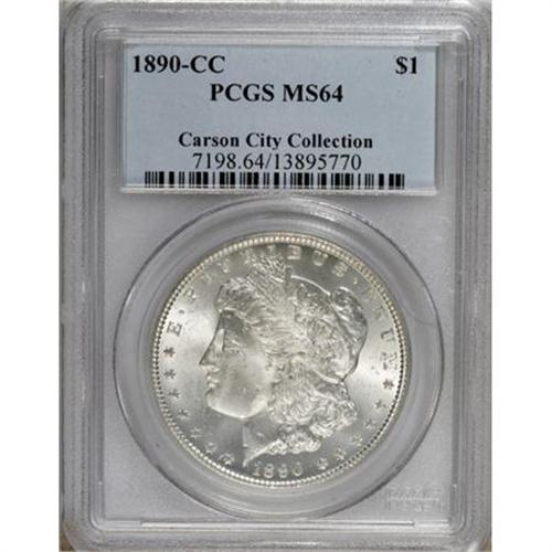 <B>1890-CC $1 MS64 PCGS.</B></I> Ex: Carson City Collection. A brilliant, flashy, intensely lustrous near-Gem from this later Carson City issue. Well struck and nicely preserved, with a few grade-limiting marks that are relatively minor for the grade. <BR><BR><b>Shipping:</b> Coins & Currency (<a target="_blank" href="http://www.heritageauctions.com/common/shipping.php">view shipping information</a>)