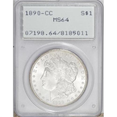 <B>1890-CC $1 MS64 PCGS. CAC.</B></I> The devices are crisply struck, and the fields offer shining luster through layers of silver-gray patina on the obverse and golden-tan toning on the reverse. Small marks and a handful of luster grazes on the portrait account for the grade. Housed in an early holder.<BR><BR><B>Coin Engraver:</B> George T. Morgan<BR><BR><b>Shipping:</b> Coins & Currency (<a target="_blank" href="http://www.heritageauctions.com/common/shipping.php">view shipping information</a>)