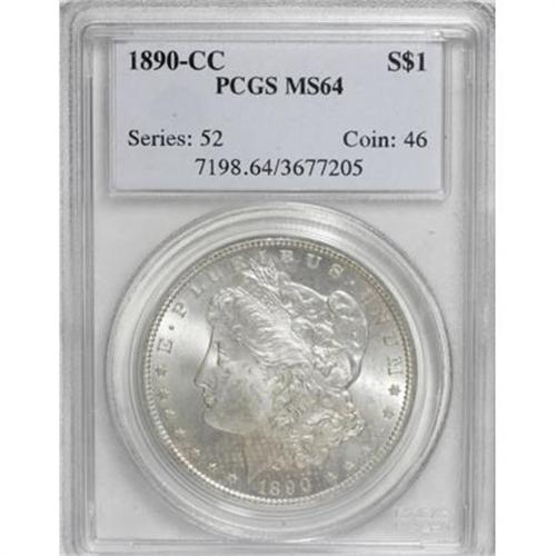 <B>1890-CC $1 MS64 PCGS.</B></I> Dapples of light gray resulting from bag toning reside on the lower obverse of this lustrous near-Gem. An attentive strike sharpens the design features, and marks on the cheek define the grade.<BR><BR><B>Coin Engraver:</B> George T. Morgan<BR><BR><b>Shipping:</b> Coins & Currency (<a target="_blank" href="http://www.heritageauctions.com/common/shipping.php">view shipping information</a>)