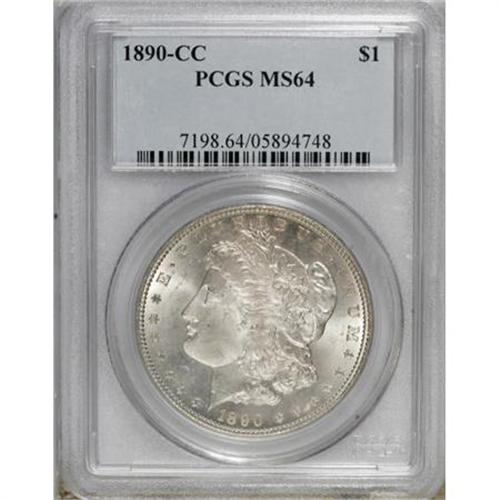 <B>1890-CC $1 MS64 PCGS.</B></I> A well struck and flashy example of this late Carson City issue. Intense cartwheel luster radiates from each side, and the surfaces display a lovely blend of silver-gray and champagne coloration. A few wispy marks limit the grade. <BR><BR><B>Coin Engraver:</B> George T. Morgan<BR><BR><b>Shipping:</b> Coins & Currency (<a target="_blank" href="http://www.heritageauctions.com/common/shipping.php">view shipping information</a>)