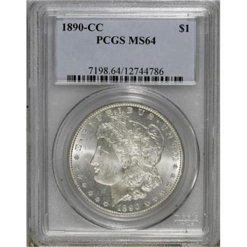 <B>1890-CC $1 MS64 PCGS.</B></I> The first 1 in the date is prominently doubled along the top upper edge. The silver-white surfaces are lustrous and nicely preserved, with a significant degree of cartwheel flash in the fields. Minor surface marks are typical for the grade. <BR><BR><B>Coin Engraver:</B> George T. Morgan<BR><BR><b>Shipping:</b> Coins & Currency (<a target="_blank" href="http://www.heritageauctions.com/common/shipping.php">view shipping information</a>)
