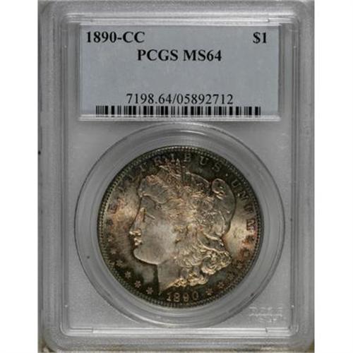 <B>1890-CC $1 MS64 PCGS.</B></I> Exquisitely detailed with soft, pleasing luster beneath captivating patina. The obverse has gold, orange, and azure peripheral toning around a silver-gray center, while the reverse shows subtle champagne tints.<BR><BR><B>Coin Engraver:</B> George T. Morgan<BR><BR><b>Shipping:</b> Coins & Currency (<a target="_blank" href="http://www.heritageauctions.com/common/shipping.php">view shipping information</a>)
