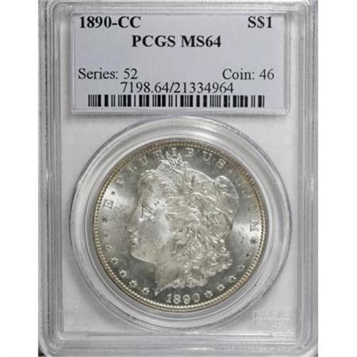 <B>1890-CC $1 MS64 PCGS.</B></I> VAM-3 with prominent recutting on the 90 in the date. Light chestnut-tan toning visits this lustrous better date CC-mint dollar. The reverse is well preserved, and the obverse is only lightly abraded. A suitable strike with some softness near Liberty's ear.<BR><I>From The Chippewa Valley Collection.</B></I><BR><BR><B>Coin Engraver:</B> George T. Morgan<BR><BR><b>Shipping:</b> Coins & Currency (<a target="_blank" href="http://www.heritageauctions.com/common/shipping.php">view shipping information</a>)