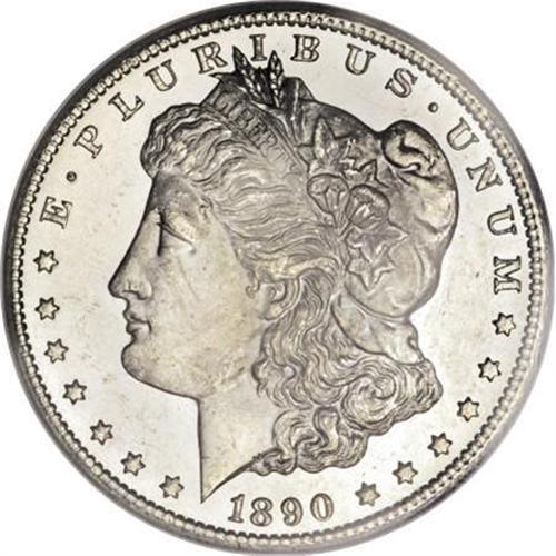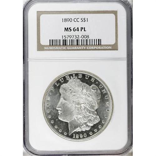 <B>1890-CC $1 MS64 Prooflike NGC.</B></I> More than 2,500 examples of the 1890-CC dollar have been certified at the MS64 grade level, by NGC and PCGS combined, while fewer than 125 coins have been certified as MS64 Prooflike by the two services. Boldly struck, with intense reflectivity noted in the fields, and just a few grade-limiting marks on the cheek, and in the left obverse field. Census: 48 in 64 Prooflike, 3 finer (1/08). <BR><BR><B>Coin Engraver:</B> George T. Morgan<BR><BR><b>Shipping:</b> Coins & Currency (<a target="_blank" href="http://www.heritageauctions.com/common/shipping.php">view shipping information</a>)
