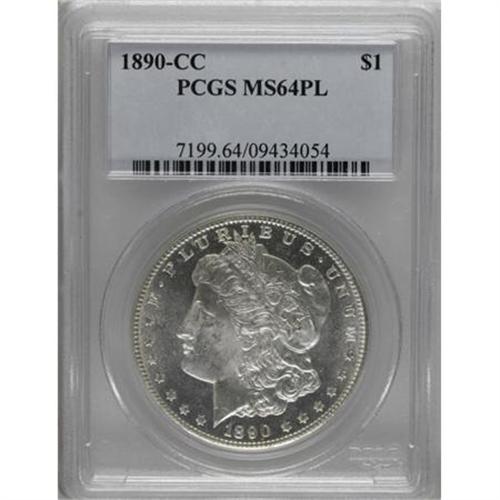 <B>1890-CC $1 MS64 Prooflike PCGS.</B></I> Mint State 1890-CC dollars with prooflike surfaces are relatively scarce, especially in the higher grades. The current near-Gem specimen displays excellent field to device contrast, and is essentially untoned except for a wisp or two of light tan-gold color. Both sides exhibit bright luster. The design features are well brought up, with the hair over Liberty's ear revealing partial definition. The grade is defined by a few minute contact marks and luster grazes on the cheek and in the upper obverse fields. Population: 68 in 64 Prooflike, 10 finer (7/07).<BR><BR><B>Coin Engraver:</B> George T. Morgan<BR><BR><b>Shipping:</b> Coins & Currency (<a target="_blank" href="http://www.heritageauctions.com/common/shipping.php">view shipping information</a>)