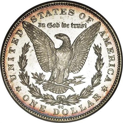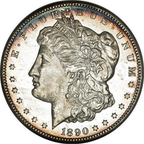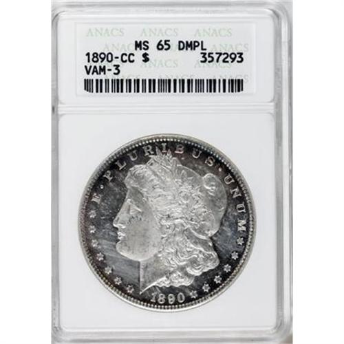 <B>1890-CC $1 MS65 Deep Mirror Prooflike ANACS.</B></I> VAM-3. The 90 in the date is recut. This amazing Gem has exceptional contrast. The fields are deeply mirrored around fully brilliant and highly lustrous devices. Each side has a ring of peripheral lilac and blue toning that serves as a splendid frame about the devices.<BR><BR><b>Shipping:</b> Coins & Currency (<a target="_blank" href="http://www.heritageauctions.com/common/shipping.php">view shipping information</a>)