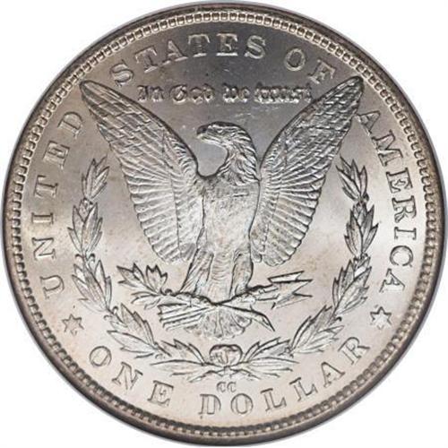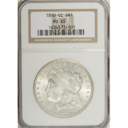 <B>1890-CC $1 MS65 NGC.</B></I> A solid strike brings about sharp definition on the design features, including the hair strands above Liberty's ear and the eagle's breast feathers. Radiantly lustrous surfaces display hints of incipient light tan-gold color at the peripheries under magnification. A couple of trivial luster grazes are located on the obverse. David Bowers (2006) estimates that over 1 million of the 2.3 million mintage was melted under the 1918 Pittman Act. Census: 56 in 65, 2 finer (6/07).<BR><I>From the Reuben Reinstein Collection.</B></I><BR><BR><b>Shipping:</b> Coins & Currency (<a target="_blank" href="http://www.heritageauctions.com/common/shipping.php">view shipping information</a>)