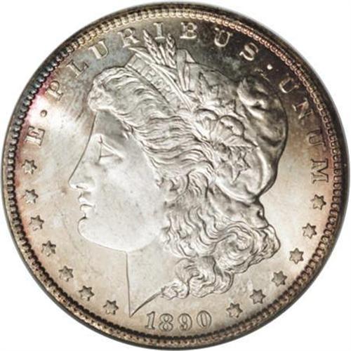 <B>1890-CC $1 MS65 NGC.</B></I> Purple, golden-tan, and cobalt-blue toning concentrates at the margins of this radiantly lustrous Carson City Gem. Well struck throughout, including good detail in the hair over Liberty's ear and on the eagle's breast feathers. Some minor marks in the left obverse filed likely prevent an even higher grade. Census: 62 in 65, 2 finer (12/07).<BR><BR><B>Coin Engraver:</B> George T. Morgan<BR><BR><b>Shipping:</b> Coins & Currency (<a target="_blank" href="http://www.heritageauctions.com/common/shipping.php">view shipping information</a>)