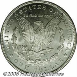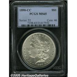 <B>1890-CC<img border='0' src='http://www.heritagecoins.com/images/star.gif' width=10 height=10>$1 MS65 PCGS.</B></I> The 1890-CC is a well-produced issue that is quite difficult to locate in strict Gem condition. This is a bright, highly frosted example that is well struck throughout. Both sides show a rich, satiny appearance, the surfaces are exceptionally clean with a full, rounded cheek on Liberty.