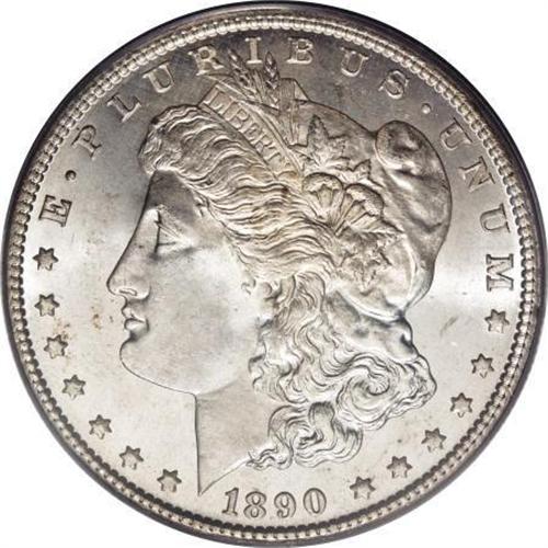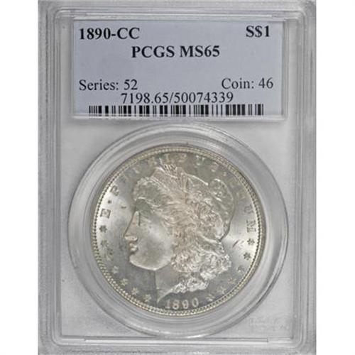 <B>1890-CC $1 MS65 PCGS.</B></I> Among Carson City Mint Morgan dollars, mintages reached their peak with this issue and its production of 2,309,041 coins. The next highest mintage CC Morgan dollar was the 1878-CC issue. This example is a frosty and lustrous Gem with sharp design elements and wonderful white color, imbued with hints of light tan on the reverse. <BR><BR><B>Coin Engraver:</B> George T. Morgan<BR><BR><b>Shipping:</b> Coins & Currency (<a target="_blank" href="http://www.heritageauctions.com/common/shipping.php">view shipping information</a>)
