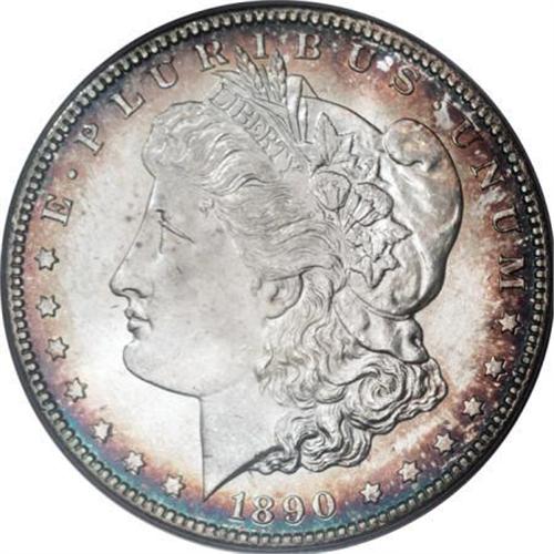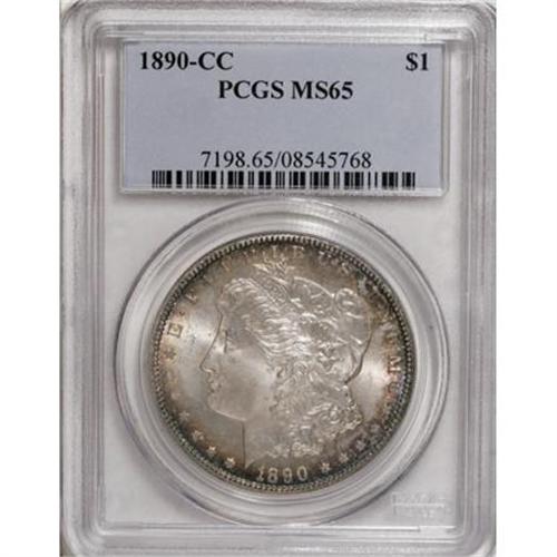 <B>1890-CC $1 MS65 PCGS.</B></I> The reverse is brilliant while the obverse has untoned centers surrounded by cobalt, cinnamon, and cerise coloration at the peripheries. A bold strike defines the details and there are no individually offensive marks that distract from the beauty of this Gem. Population: 220 in 65, with PCGS grading only nine examples finer (11/07).<BR><BR><B>Coin Engraver:</B> George T. Morgan<BR><BR><b>Shipping:</b> Coins & Currency (<a target="_blank" href="http://www.heritageauctions.com/common/shipping.php">view shipping information</a>)