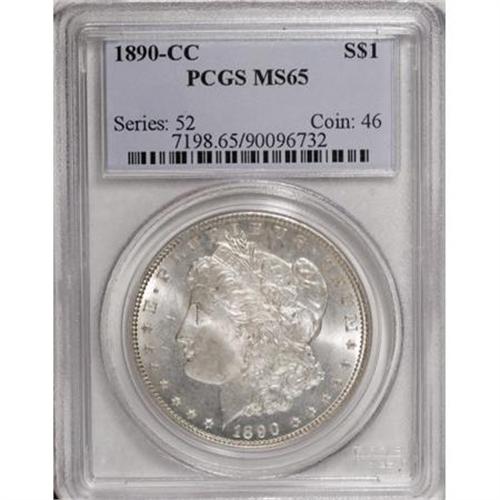 <B>1890-CC $1 MS65 PCGS.</B></I> This remarkable Gem is lightly toned, and has vibrant luster and outstanding preservation. By Carson City standards, the mintage of the 1890-CC is relatively high, since more than 2.3 million pieces were struck. Still, the 1890-CC was comparatively underrepresented in the GSA sales, and as such, finer pieces are exceedingly elusive; PCGS has graded only nine such coins (1/08).<BR><I>From The Oxford Collection.</B></I><BR><BR><B>Coin Engraver:</B> George T. Morgan<BR><BR><b>Shipping:</b> Coins & Currency (<a target="_blank" href="http://www.heritageauctions.com/common/shipping.php">view shipping information</a>)