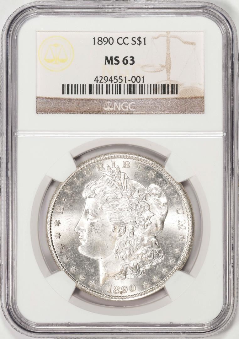 One 1890-CC $1 Morgan Silver Dollar Coin NGC MS63. NGC Certified.