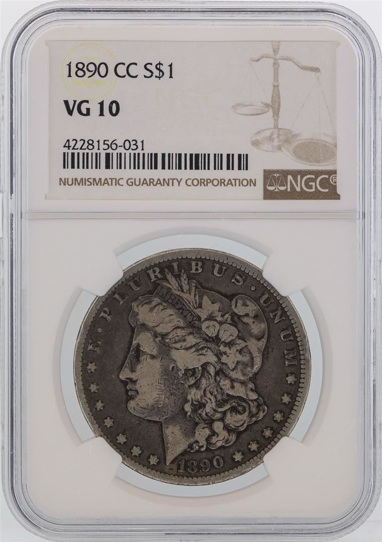 One 1890-CC $1 Morgan Silver Dollar Coin NGC VG10. NGC Certified.