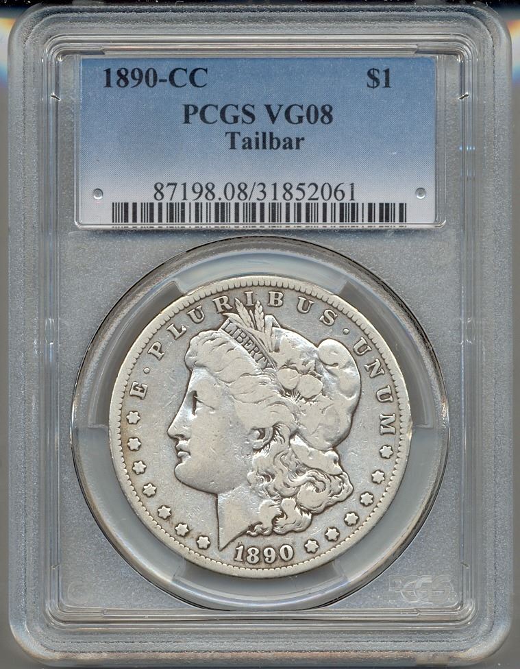 One 1890-CC $1 Morgan Silver Dollar PCGS VG08 Tailbar.