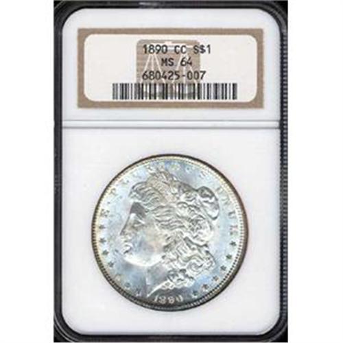 Dazzling bright surfaces and uncommon beauty in a near-gem MS64 1890-CC. The luster on these typically has a density to it that is refreshing in its brilliance and appearance.