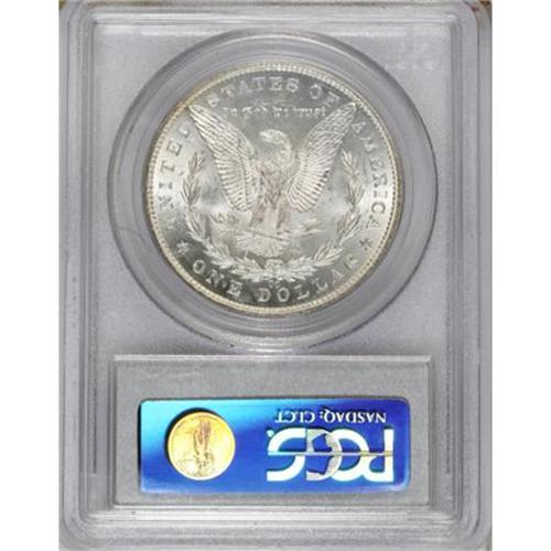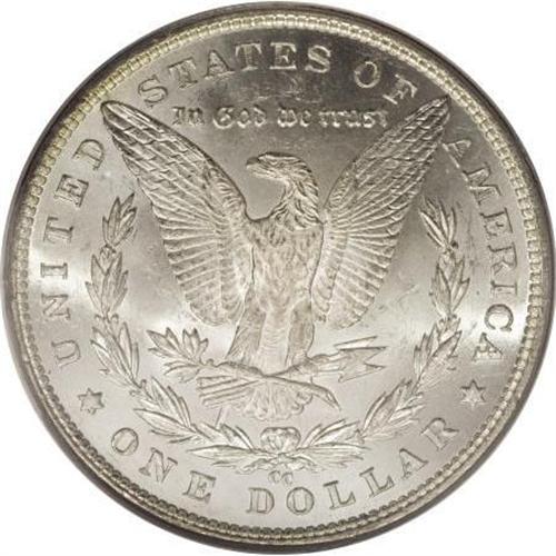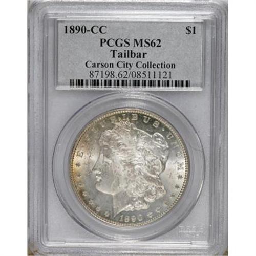 <B>1890-CC $1 Tail Bar MS62 PCGS.</B></I> Ex: Carson City Collection. Original dusky gray patina on the obverse shows an arc of golden toning on the left rim. The reverse is completely brilliant. Sharply struck. A number of small to medium-sized abrasions on each side account for the grade. A popular and easy-to-identify variety (actually an error).<BR><BR><b>Shipping:</b> Coins & Currency (<a target="_blank" href="http://www.heritageauctions.com/common/shipping.php">view shipping information</a>)