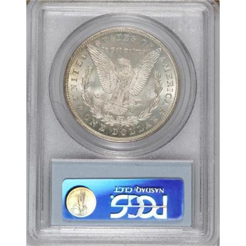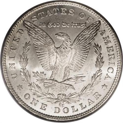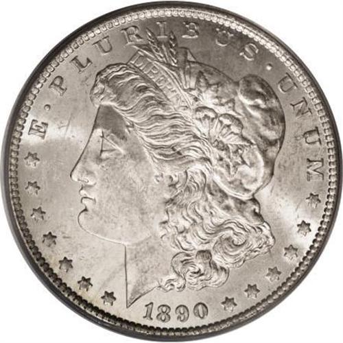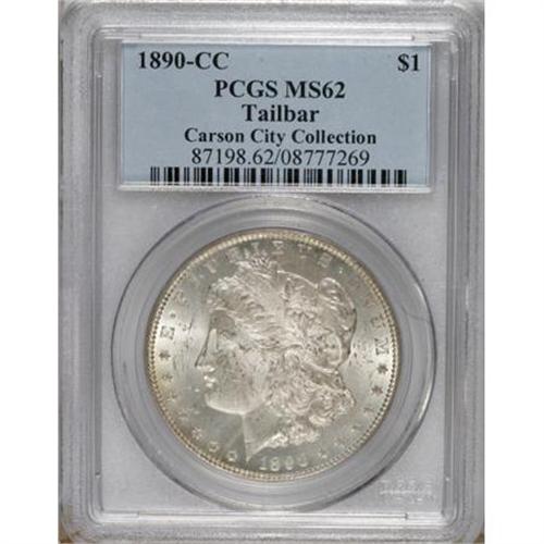 <B>1890-CC $1 Tail Bar MS62 PCGS.</B></I> VAM-4, A Top 100 Variety. Ex: Carson City Collection. A large die bar (as made) on the lower reverse connects the wreath leaves to the eagle's tail feather and arrow fletchings above. Brilliant on the obverse, with faint sprays of reddish patina noted on the upper reverse fields. The design elements are well struck. The reverse is carefully preserved, while the obverse exhibits moderate scuffiness that limits the grade. <BR><BR><b>Shipping:</b> Coins & Currency (<a target="_blank" href="http://www.heritageauctions.com/common/shipping.php">view shipping information</a>\)