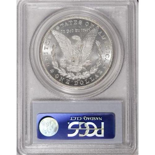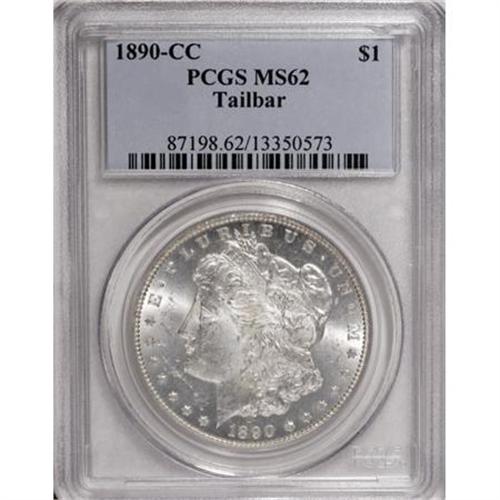 <B>1890-CC $1 Tail Bar MS62 PCGS.</B></I> VAM-4. A Top 100 Variety. Boldly struck, flashy, and brilliant aside from faint gold toning on the central obverse. Moderate marks near the chin decide the grade, but the reverse is impressively smooth.<BR><BR><b>Shipping:</b> Coins & Currency (<a target="_blank" href="http://www.heritageauctions.com/common/shipping.php">view shipping information</a>)