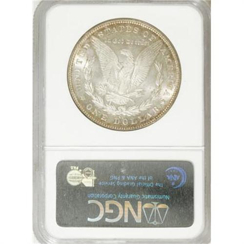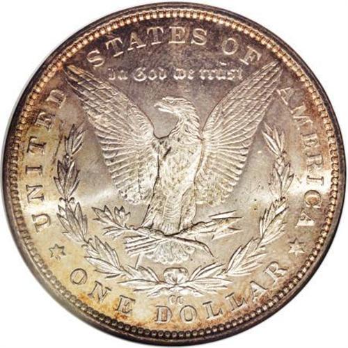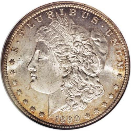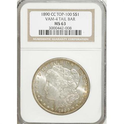 <B>1890-CC $1 Tail Bar MS63 NGC. CAC.</B></I> VAM-4. A Top 100 Variety. A spectacular die gouge connects the arrow feathers with the wreath. Lustrous surfaces display golden-tan toning concentrated at the peripheries of both sides, and sharp definition results from an impressive strike, including good detail in the hair at Liberty's ear and the eagle's breast feathers. The few handling marks that account for the grade are not overly bothersome.<BR><BR><b>Shipping:</b> Coins & Currency (<a target="_blank" href="http://www.heritageauctions.com/common/shipping.php">view shipping information</a>)