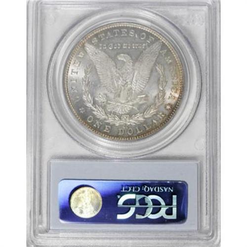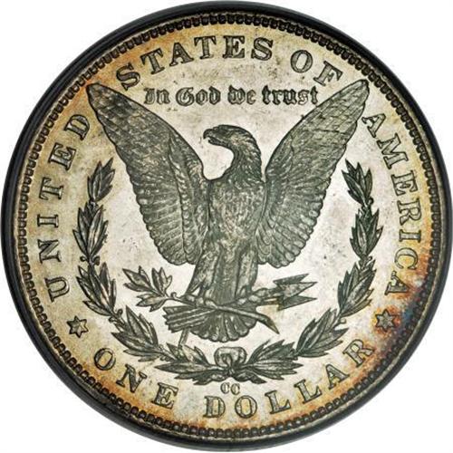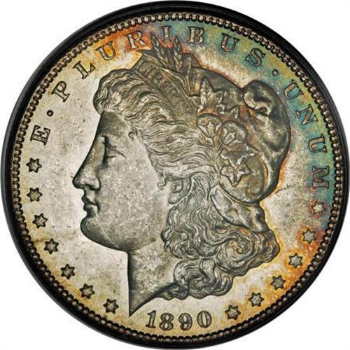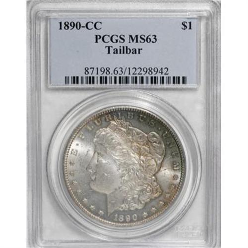 <B>1890-CC $1 Tail Bar MS63 PCGS.</B></I> VAM-4. A Top 100 Variety. Fairly prooflike on each side, with lovely, radiant luster and delightful coloration: mint-green and amber-gold on an obverse crescent, light amber-gold at the reverse rim, and silvery elsewhere. A nice, high-end piece for the assigned grade, despite a few contact marks.<BR><BR><b>Shipping:</b> Coins & Currency (<a target="_blank" href="http://www.heritageauctions.com/common/shipping.php">view shipping information</a>)