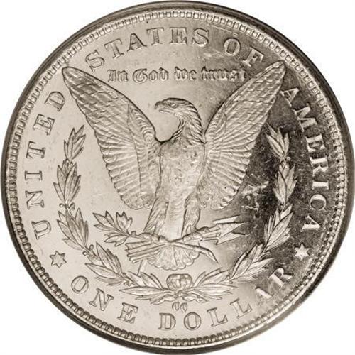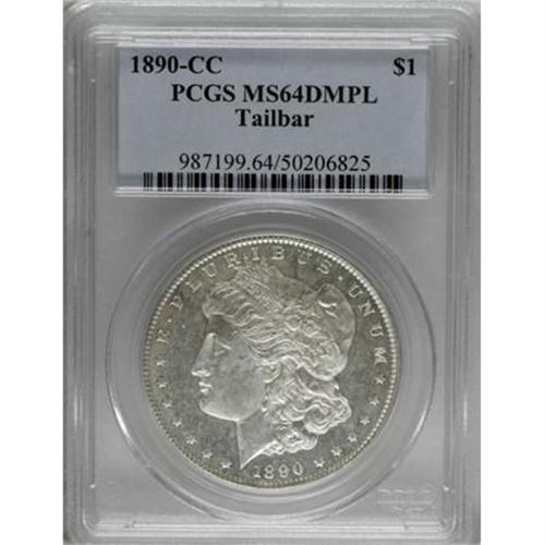 <B>1890-CC $1 Tail Bar MS64 Deep Mirror Prooflike PCGS.</B></I> VAM-4. Top 100 Variety. Identified by a spectacular die gouge that runs from the juncture of the arrow feathers and the eagle's tailfeathers down to the wreath. In their <I>The Top 100 Morgan Dollar Varieties: The VAM Keys</B></I>, Michael Fey and Jeff Oxman say of this variety: "Heavily promoted as a major rarity, the VAM-4 is actually more common than most collector's realize." While some numismatists may debate the authors' contention about the variety's rarity level, Deep Mirror Prooflike examples, like the near-Gem specimen in this lot, are anything but common. Indeed, when Fey and Oxman wrote their booklet (1996), they indicated that Deep Mirror Prooflike specimens were unknown!<BR> An attentive strike brings out sharp definition on the design elements, including the hair at Liberty's ear and the eagle's breast feathers. The only hint of patina are some milky freckles visible under magnification. A few minor marks on each side preclude full Gem status. Population: 4 in 64, 0 finer (7/07).<BR><BR><b>Shipping:</b> Coins & Currency (<a target="_blank" href="http://www.heritageauctions.com/common/shipping.php">view shipping information</a>)