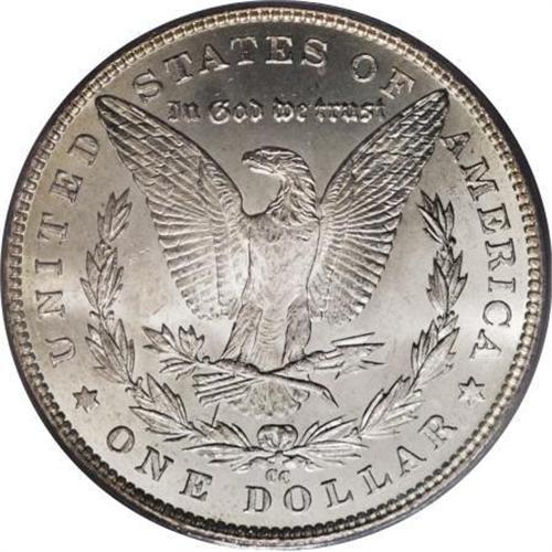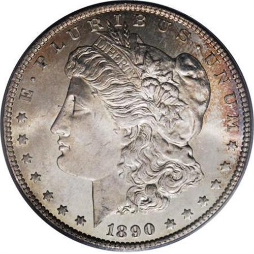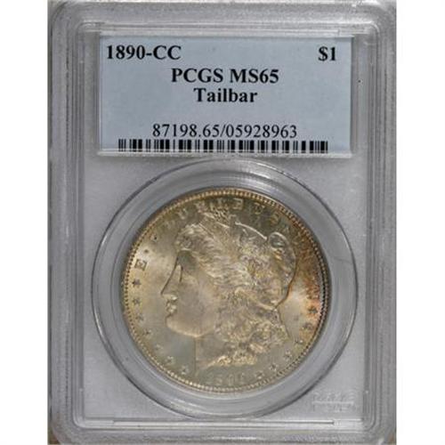 <B>1890-CC $1 Tail Bar MS65 PCGS.</B></I> VAM-4. A Top 100 Variety. Here it is, the single finest PCGS-certified 1890-CC Tailbar dollar. NGC has also certified only one example as MS65, as of (6/07). Of course, a few pieces may lurk within undesignated third party holders, but the significance of the present opportunity cannot be overemphasized. The Tailbar variety is a well known "naked eye" variety, immediately confirmed by the presence of a broad die line beneath the left edge of the tailfeathers.<BR> This lustrous Gem has orange-red and lemon peripheral shadings. The strike is precise, and the fields are gorgeously smooth. Only a couple of inconspicuous portrait grazes determine the grade. Population: 1 in 65, 0 finer (6/07).<BR><BR><b>Shipping:</b> Coins & Currency (<a target="_blank" href="http://www.heritageauctions.com/common/shipping.php">view shipping information</a>)