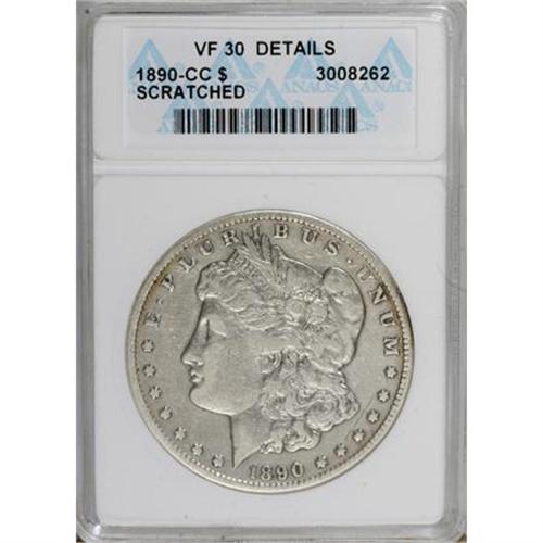 <B>1890-CC $1 --Scratched--ANACS. VF30 Details.</B></I> NGC Census: (22/3550). PCGS Population (15/7542). Mintage: 2,309,041. Numismedia Wsl. Price for NGC/PCGS coin in VF30: $105. (#7198)<BR><BR><B>Coin Engraver:</B> George T. Morgan<BR><BR><b>Shipping:</b> Coins & Currency (<a target="_blank" href="http://www.heritageauctions.com/common/shipping.php">view shipping information</a>)