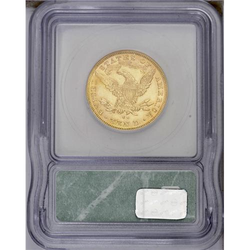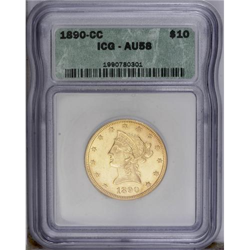 <B>1890-CC<$10> AU58 ICG.</B></I> This well struck piece has substantial luster and no oppressive marks. A better Carson City date, due to a stingy production of 17,500 pieces.<BR><I>From The Steve Glenn Collection.</B></I> <BR><BR><B>Important notice:</B> Heritage usually auctions material at the rate of 200-250 lots per hour. On some occasions eBay Live bid software or the Internet may not be able to keep up with the pace of the auction. We recommend placing a realistic absentee bid now as insurance to avoid disappointment. Occasionally the auctioneer may eliminate or reject an eBay Live bid, and the auctioneer may also reopen a lot after the close of the eBay live bidding (usually because we missed an audience bid), and may reject your bid even if it shows you as the winning bidder. By bidding via eBay Live, you agree that Heritage may award the lot to another bidder at its sole discretion under the circumstances described above or any other reasonable circumstances. Since eBay bids are not shown to us until we open the lot on the floor, we treat those bids just like floor bids. In most cases the floor responds before the eBay bid is presented to us, due to Internet lag time, so for consistency we have made it a policy that floor bids are always considered first over tie eBay live bids. Also please note that all Heritage lots purchased through eBay Live carry a 20% Buyer's Premium. Please make sure you read the Terms and Conditions before you bid. This lot is being auctioned in conjunction with a live floor auction by Heritage Galleries & Auctioneers. All final auction and invoice information will be supplied by Heritage Galleries & Auctioneers, and all other information should be considered preliminary. Lot:4018 <BR><BR><B>Winning Notification and Billing:</B> After the FINAL session in this auction is complete, Heritage will send e-mail and snail mail invoices. This process normally takes several days. All final auction and invoice information will be supplied by Heritage Galleries & Auctioneers, and all other information should be considered preliminary. <BR><BR>This auction will be conducted on a live auction floor and over the Internet through eBay Live. If you choose to place an absentee bid, please take a moment to <font color='#0000ff'><u><a href='http://pages.ebay.com/liveauctions/help/before/laabsentee.html'>learn how eBay Live absentee bidding works</a></u></font><font color='#000000'>