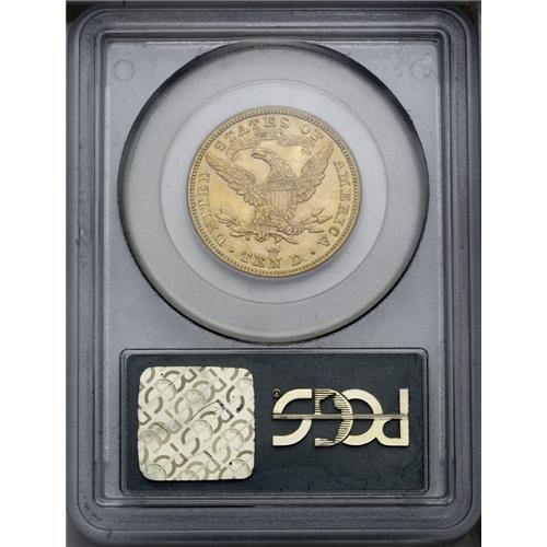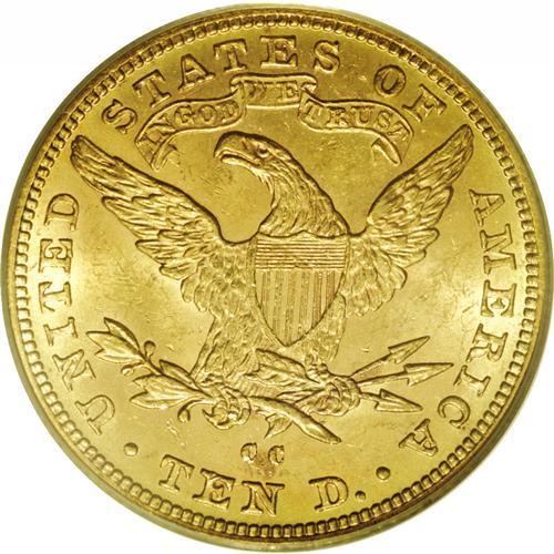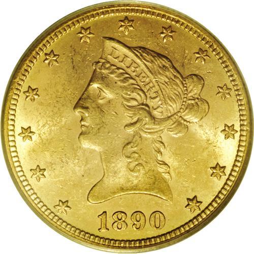 <B>1890-CC $10 MS60 PCGS.</B></I> Unbroken mint luster and a bold strike combine with original honey-gold color for attractive eye appeal. Abrasions are distributed but never oppressive. IN GOD WE TRUST is lightly die doubled, perhaps the case for all of this low mintage issue. A mere 17,500 pieces were struck, less than one-fifth the mintage of the 1891-CC. Certified in an old green label PCGS holder. Population: 20 in 60, 62 finer (12/05).