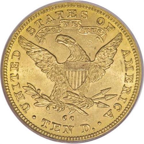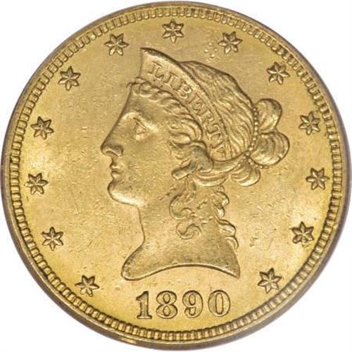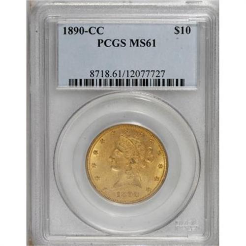 <B>1890-CC $10 MS61 PCGS.</B></I> An original orange and green-gold ten dollar piece that has an even strike and no mentionable marks. Luster inundates the borders and devices. IN GOD WE TRUST is lightly die doubled, diagnostic for this scarce low mintage Carson City issue. Population: 20 in 61, 38 finer (8/07).<BR><BR><B>Coin Engraver:</B> Christian Gobrecht<BR><BR><b>Shipping:</b> Coins & Currency (<a target="_blank" href="http://www.heritageauctions.com/common/shipping.php">view shipping information</a>)