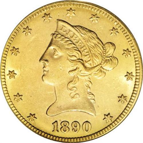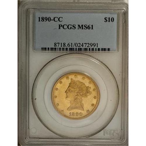 <B>1890-CC $10 MS61 PCGS.</B></I> Original apricot toning enriches this satiny and boldly impressed representative. A glass reveals small marks, but the overall appearance is clean for the usually abraded MS61 level. Minor die doubling on IN GOD WE TRUST and STATES OF is diagnostic for this better Carson City issue. Population: 20 in 61, 38 finer (11/07).<BR><BR><B>Coin Engraver:</B> Christian Gobrecht<BR><BR><b>Shipping:</b> Coins & Currency (<a target="_blank" href="http://www.heritageauctions.com/common/shipping.php">view shipping information</a>)