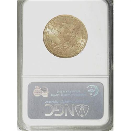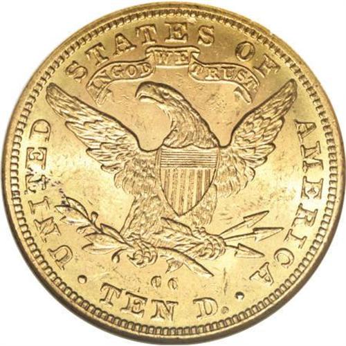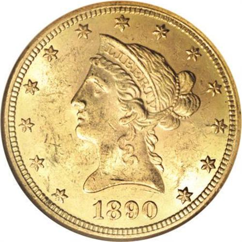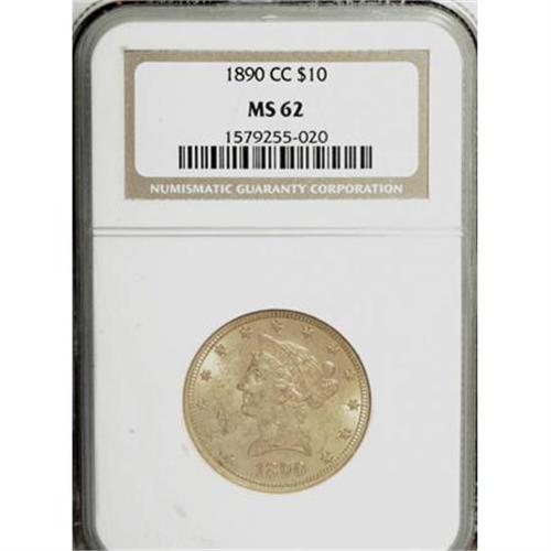 <B>1890-CC $10 MS62 NGC.</B></I> The 1890-CC has close proximity to the frequently encountered 1891-CC, but the 1890-CC is considerably scarcer. Only 17,500 pieces were struck, and only a tiny fraction of these remain in Mint State. This crisply struck and lustrous almond-gold example is moderately abraded and has a few minute struck-in grease flecks near the T in UNITED. Census: 34 in 62, 12 finer (11/07).<BR><BR><B>Coin Engraver:</B> Christian Gobrecht<BR><BR><b>Shipping:</b> Coins & Currency (<a target="_blank" href="http://www.heritageauctions.com/common/shipping.php">view shipping information</a>)