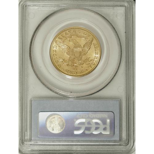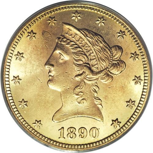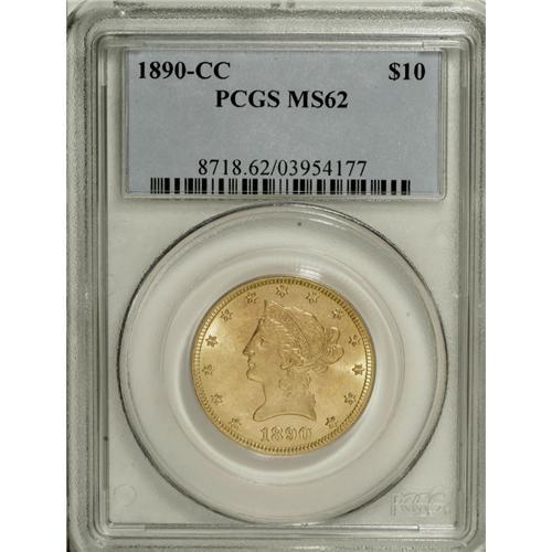 <B>1890-CC $10 MS62 PCGS.</B></I> An attractive representative of this later Carson City issue, well struck with vibrant luster and hints of apricot against straw-gold surfaces. The numerous minor abrasions that limit the grade have surprisingly little impact on the overall eye appeal, and though the population distribution skews toward lower About Uncirculated, MS62 and better pieces remain elusive. Population: 28 in 62, 9 finer (2/07).<BR><BR><b>Shipping:</b> Coins & Currency (<a target="_blank" href="http://www.heritageauctions.com/common/shipping.php">view shipping information</a>)